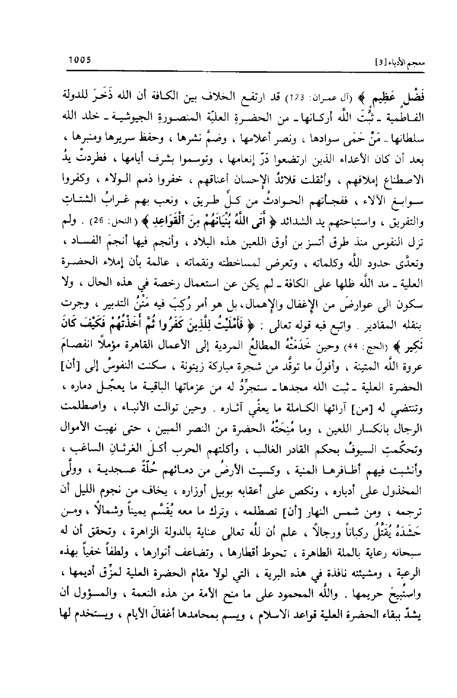 (النحل: 26) . ولم تزل النفوس منذ طرق أتسز بن أوق اللعين هذه البلاد، وأنجم فيها أنجم الفساد، وتعدّى حدود الله وكلماته، وتعرض لمساخطته ونقماته، عالمة بأن إملاء الحضرة العلية- مد الله ظلها على الكافة- لم يكن عن استعمال رخصة في هذه الحال، ولا سكون الى عوارض من الإغفال والإهمال، بل هو أمر ركب فيه متن التدبير، وجرت بنقله المقادير. واتبع فيه قوله تعالى: فَأَمْلَيْتُ لِلْكافِرِينَ ثُمَّ أَخَذْتُهُمْ فَكَيْفَ كانَ نَكِيرِ