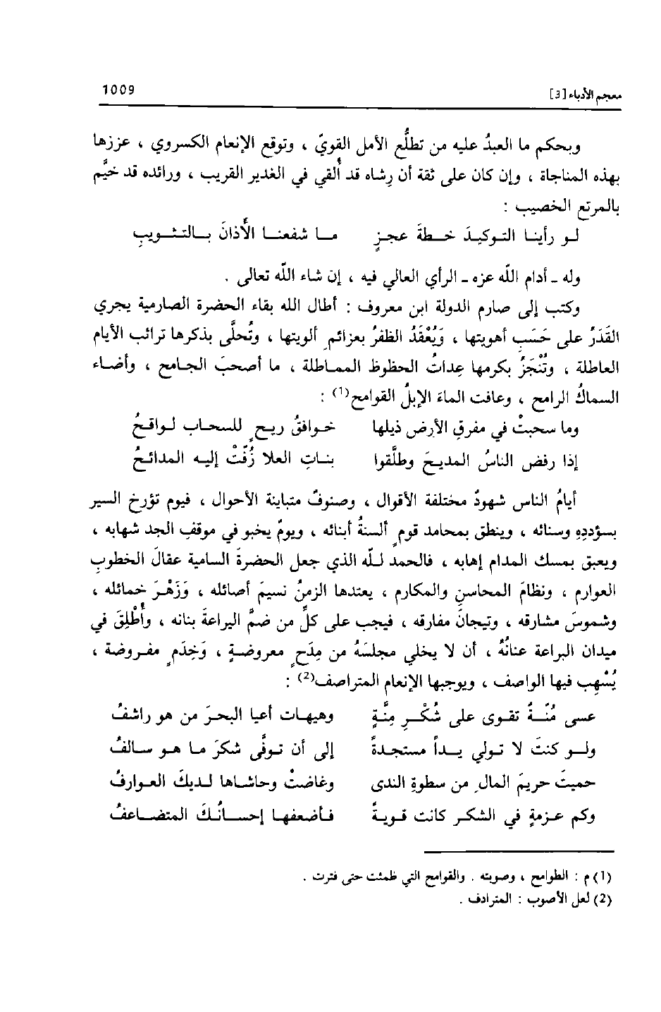 أيام الناس شهود مختلفة الأقوال، وصنوف متباينة الأحوال، فيوم تؤرخ السير بسؤدده وسنائه، وينطق بمحامد قوم ألسنة أبنائه، ويوم يخبو في موقف الجد شهابه، ويعبق بمسك المدام إهابه، فالحمد لله الذي جعل الحضرة السامية عقال الخطوب العوارم، ونظام المحاسن والمكارم، يعتدها الزمن نسيم أصائله، وزهر خمائله، وشموس مشارقه، وتيجان مفارقه، فيجب على كلّ من ضمّ اليراعة بنانه، وأطلق في ميدان البراعة عنانه، أن لا يخلي مجلسه من مدح معروضة، وخدم مفروضة، يسهب فيها الواصف، ويوجبها الإنعام المتراصف [2] :
