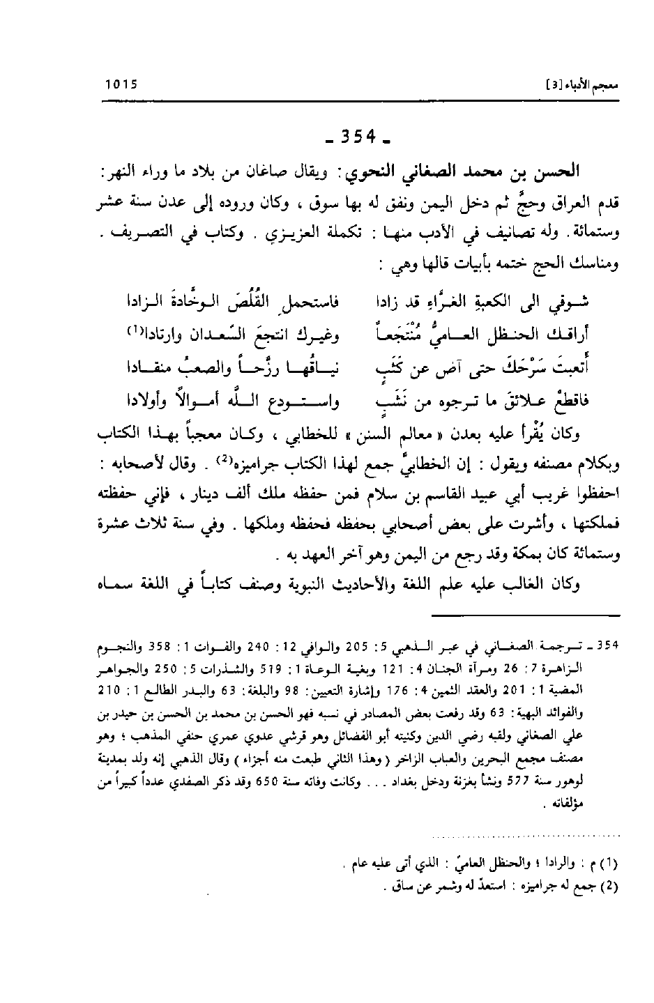 [354]- ترجمة الصغاني في عبر الذهبي 5: 205 والوافي 12: 240 والفوات 1: 358 والنجوم الزاهرة 7: 26 ومرآة الجنان 4: 121 وبغية الوعاة 1: 519 والشذرات 5: 250 والجواهر المضية 1: 201 والعقد الثمين 4: 176 وإشارة التعيين: 98 والبلغة: 63 والبدر الطالع 1: 210 والفوائد البهية: 63 وقد رفعت بعض المصادر في نسبه فهو الحسن بن محمد بن الحسن بن حيدر بن علي الصغاني ولقبه رضي الدين وكنيته أبو الفضائل وهو قرشي عدوي عمري حنفي المذهب؛ وهو مصنف مجمع البحرين والعباب الزاخر (وهذا الثاني طبعت منه أجزاء) وقال الذهبي إنه ولد بمدينة لوهور سنة 577 ونشأ بغزنة ودخل بغداد ... وكانت وفاته سنة 650 وقد ذكر الصفدي عددا كبيرا من مؤلفاته.