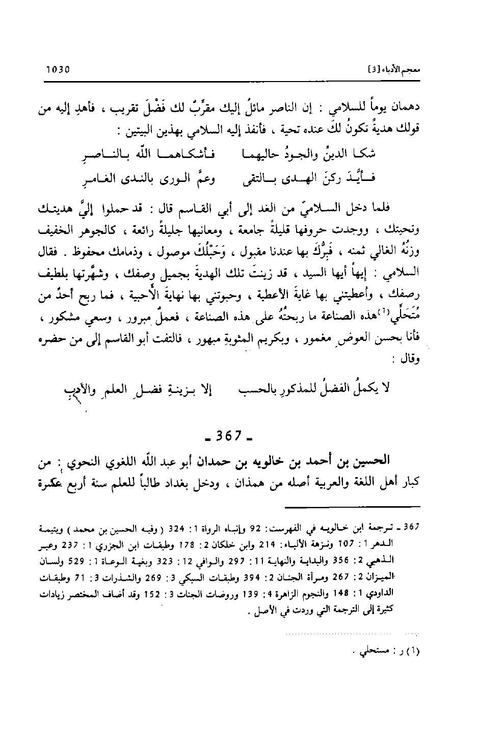 [367]- ترجمة ابن خالويه في الفهرست: 92 وإنباه الرواة 1: 324 (وفيه الحسين بن محمد) ويتيمة الدهر 1: 107 ونزهة الألباء: 214 وابن خلكان 2: 178 وطبقات ابن الجزري 1: 237 وعبر الذهبي 2: 356 والبداية والنهاية 11: 297 والوافي 12: 323 وبغية الوعاة 1: 529 ولسان الميزان 2: 267 ومرآة الجنان 2: 394 وطبقات السبكي 3: 269 والشذرات 3: 71 وطبقات الداودي 1: 148 والنجوم الزاهرة 4: 139 وروضات الجنات 3: 152 وقد أضاف المختصر زيادات كثيرة إلى الترجمة التي وردت في الأصل.