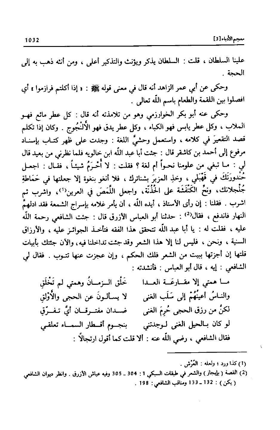 [2] القصة (بإيجاز) والشعر في طبقات السبكي 1: 304- 305 وفيه عياش الأزرق. وانظر ديوان الشافعي (يكن) : 132- 133 ومناقب الشافعي: 198.
