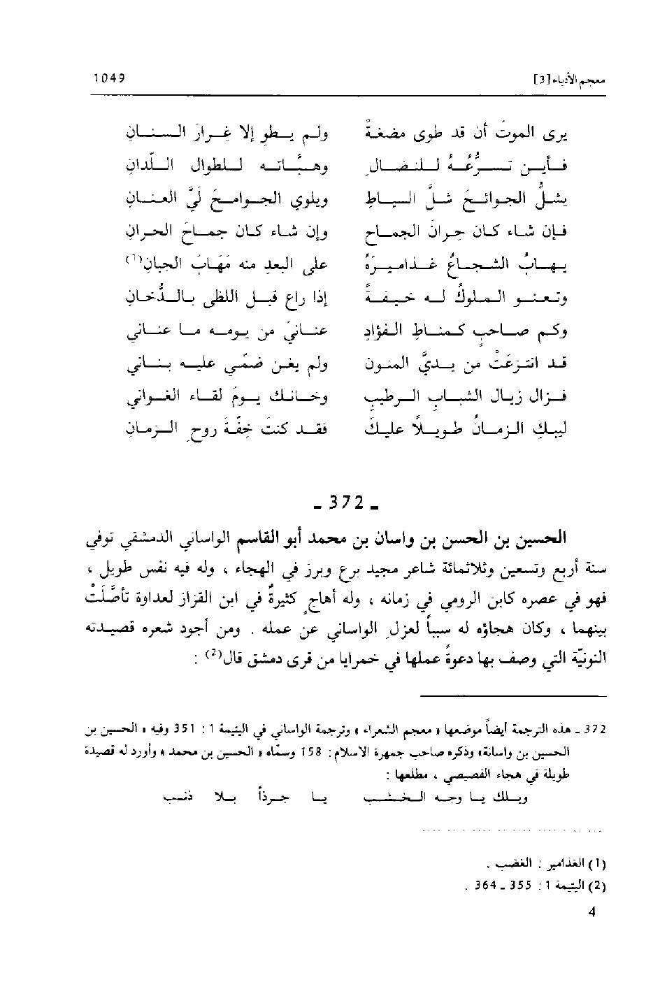 [372]- هذه الترجمة أيضا موضعها «معجم الشعراء» وترجمة الواساني في اليتيمة 1: 351 وفيه «الحسين بن الحسين بن واسانة» وذكره صاحب جمهرة الاسلام: 158 وسمّاه «الحسين بن محمد» وأورد له قصيدة طويلة في هجاء الفصيصي، مطلعها: