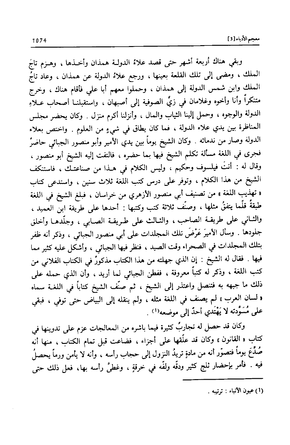 وبقي هناك أربعة أشهر حتى قصد علاء الدولة همذان وأخذها، وهزم تاج الملك، ومضى إلى تلك القلعة بعينها، ورجع علاء الدولة عن همذان، وعاد تاج الملك وابن شمس الدولة إلى همذان، وحملوا معهم أبا علي فأقام هناك، وخرج متنكرا وأنا وأخوه وغلامان في زيّ الصوفية إلى أصبهان، واستقبلنا أصحاب علاء الدولة والوجوه، وحمل إلينا الثياب والمال، وأنزلنا أكرم منزل. وكان يحضر مجلس المناظرة بين يدي علاء الدولة، فما كان يطاق في شيء من العلوم. واختص بعلاء الدولة وصار من ندمائه. وكان الشيخ يوما بين يدي الأمير وأبو منصور الجبائي حاضر فجرى في اللغة مسألة تكلم الشيخ فيها بما حضره، فالتفت إليه الشيخ أبو منصور، وقال له: أنت فيلسوف وحكيم، وليس الكلام في هذا من صناعتك، فاستنكف الشيخ من هذا الكلام، وتوفر على درس كتب اللغة ثلاث سنين، واستدعى كتاب «تهذيب اللغة» من تصنيف أبي منصور الأزهري من خراسان، فبلغ الشيخ في اللغة طبقة قلّما يتفق مثلها، وصنّف ثلاثة كتب وكتبها: أحدها على طريقة ابن العميد، والثاني على طريقة الصاحب، والثالث على طريقة الصابي، وجلّدها وأخلق جلودها. وسأل الأمير عرض تلك المجلدات على أبي منصور الجبائي، وذكر أنه ظفر بتلك المجلدات في الصحراء وقت الصيد، فنظر فيها الجبائي، وأشكل عليه كثير مما فيها. فقال له الشيخ: إن الذي جهلته من هذا الكتاب مذكور في الكتاب الفلاني من كتب اللغة، وذكر له كتبا معروفة، ففطن الجبائي لما أريد، وأن الذي حمله على ذلك ما جبهه به فتنصل واعتذر إلى الشيخ، ثم صنّف الشيخ كتابا في اللغة سماه «لسان العرب» لم يصنف في اللغة مثله، ولم ينقله إلى البياض حتى توفي، فبقي على مسوّدته لا يهتدي أحد إلى موضعه [1] .