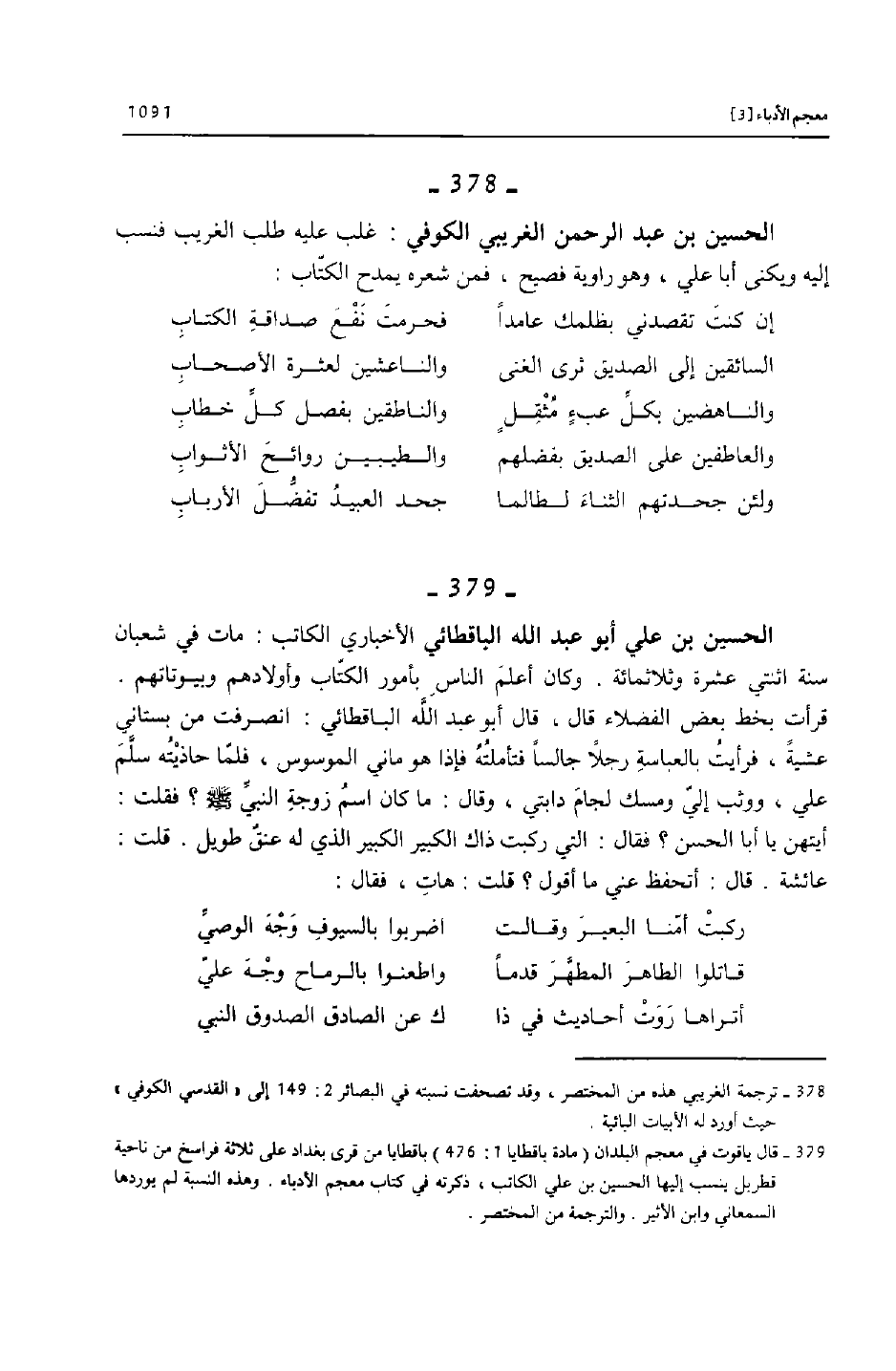 [378]- ترجمة الغريبي هذه من المختصر، وقد تصحفت نسبته في البصائر 2: 149 إلى «القدسي الكوفي» حيث أورد له الأبيات البائية.