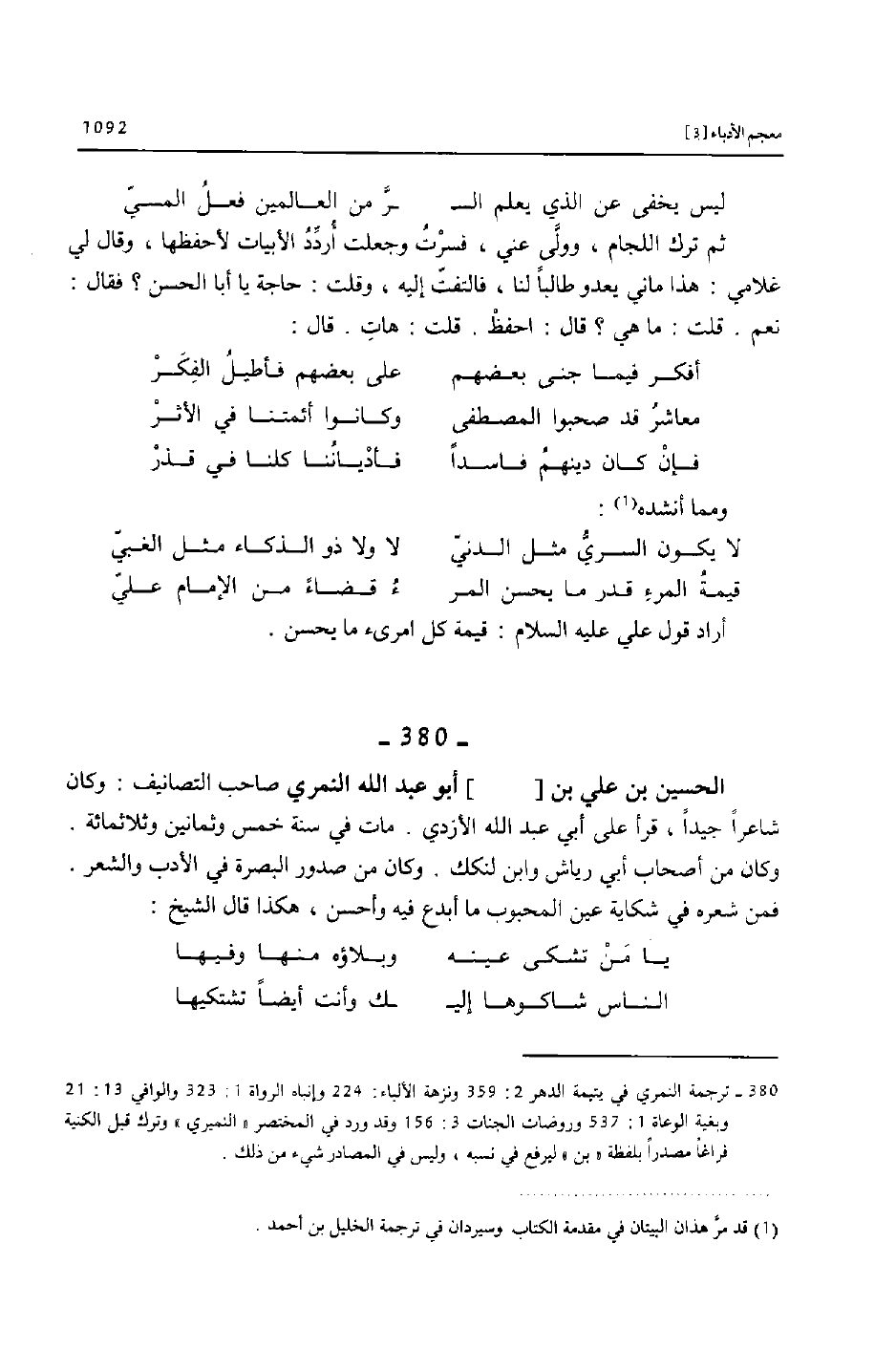 [380]- ترجمة النمري في يتيمة الدهر 2: 359 ونزهة الألباء: 224 وإنباه الرواة 1: 323 والوافي 13: 21 وبغية الوعاة 1: 537 وروضات الجنات 3: 156 وقد ورد في المختصر «النميري» وترك قبل الكنية فراغا مصدرا بلفظة «بن» ليرفع في نسبه، وليس في المصادر شيء من ذلك.