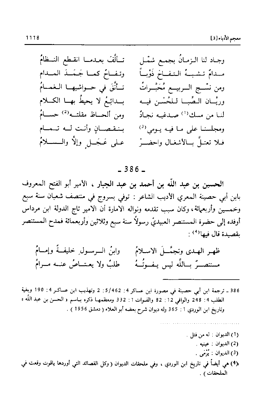[386]- ترجمة ابن أبي حصينة في مصورة ابن عساكر 4: 462/5: 2 وتهذيب ابن عساكر 4: 190 وبغية الطلب 4: 248 والوافي 12: 82 والفوات 1: 332 ومعظمها ذكره باسم «الحسن بن عبد الله» وتاريخ ابن الوردي 1: 365 وله ديوان شرح بعضه أبو العلاء (دمشق 1956) .