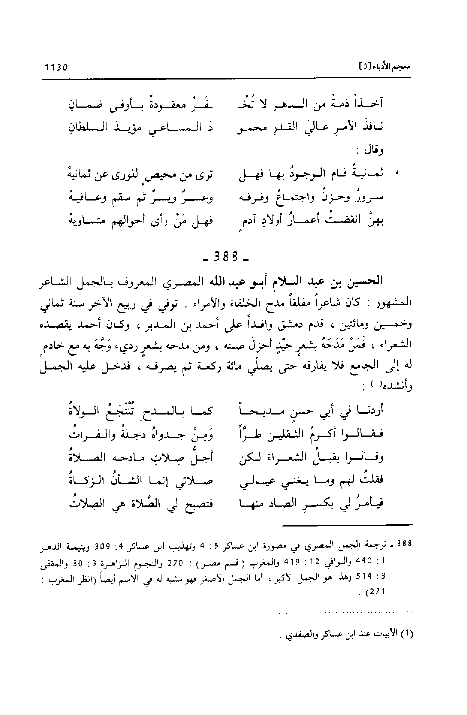 [388]- ترجمة الجمل المصري في مصورة ابن عساكر 5: 4 وتهذيب ابن عساكر 4: 309 ويتيمة الدهر 1: 440 والوافي 12: 419 والمغرب (قسم مصر) : 270 والنجوم الزاهرة 3: 30 والمقفى 3: 514 وهذا هو الجمل الأكبر، أما الجمل الأصغر فهو مشبه له في الاسم أيضا (انظر المغرب: