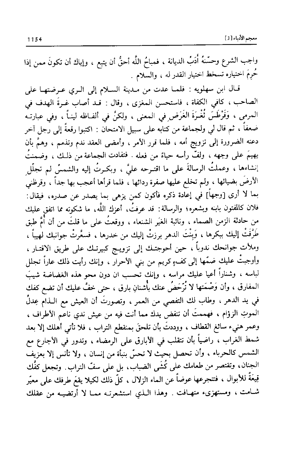 فلان كالمفتون بابنه وبشعره؛ والرسالة: قد عرفت، أعزك الله، ما شكوته مما اتفق عليك من حادثة الزمن الصماء، ونائبة الغير الشنعاء، ووقعت على ما قلت من أن أمّ طبق طرّقت إليك ببكرها، وبنت الدهر برزت إليك من خدرها، فسعّرت جوانبك لهيبا، وملأت جوانحك ندوبا، حين أحوجتك إلى تزويج كبيرتك على طريق الاقتار، وأوجبت عليك ضمّها إلى كفء كريم من بني الأحرار، وإنك رأيت ذلك عارا تجلل لباسه، وشنارا أعيا عليك مراسه، وإنك تحسب ان دون محو هذه الغضاضة شيب المفارق، وأن وصمتها لا ترّحض عنك بأشنان بارق، حتى خفّ عليك أن تضع كفك في يد الدهر، وطاب لك التفصي من العمر، وتصورت أن العيش مع الذام عدل الموت الزؤام، فهممت أن تنفض يدك مما أنت فيه من عيش ندي ناعم الأطراف، وعمر هنيء سائغ القطاف، ووددت بأن تلحق بمنقطع التراب، فلا تأتي أهلك إلا بعد شمط الغراب، راضيا بأن تتقلب في الأبارق على الرمضاء، وتدور في الأجارع مع الشمس كالحرباء، وأن تحصل بحيث لا تحسّ بنبأة من إنسان، ولا تأنس إلا بعزيف الجنان، وتقتصر من طعامك على كشى الضباب، بل على سفّ التراب. وتجعل كفّك قيعة للأبوال، فتتجرعها عوضا عن الماء الزلال، كلّ ذلك لكيلا يقع طرفك على معيّر شامت، ومستهزىء متهافت. وهذا الذي استشعرته مما لا أرتضيه من عقلك