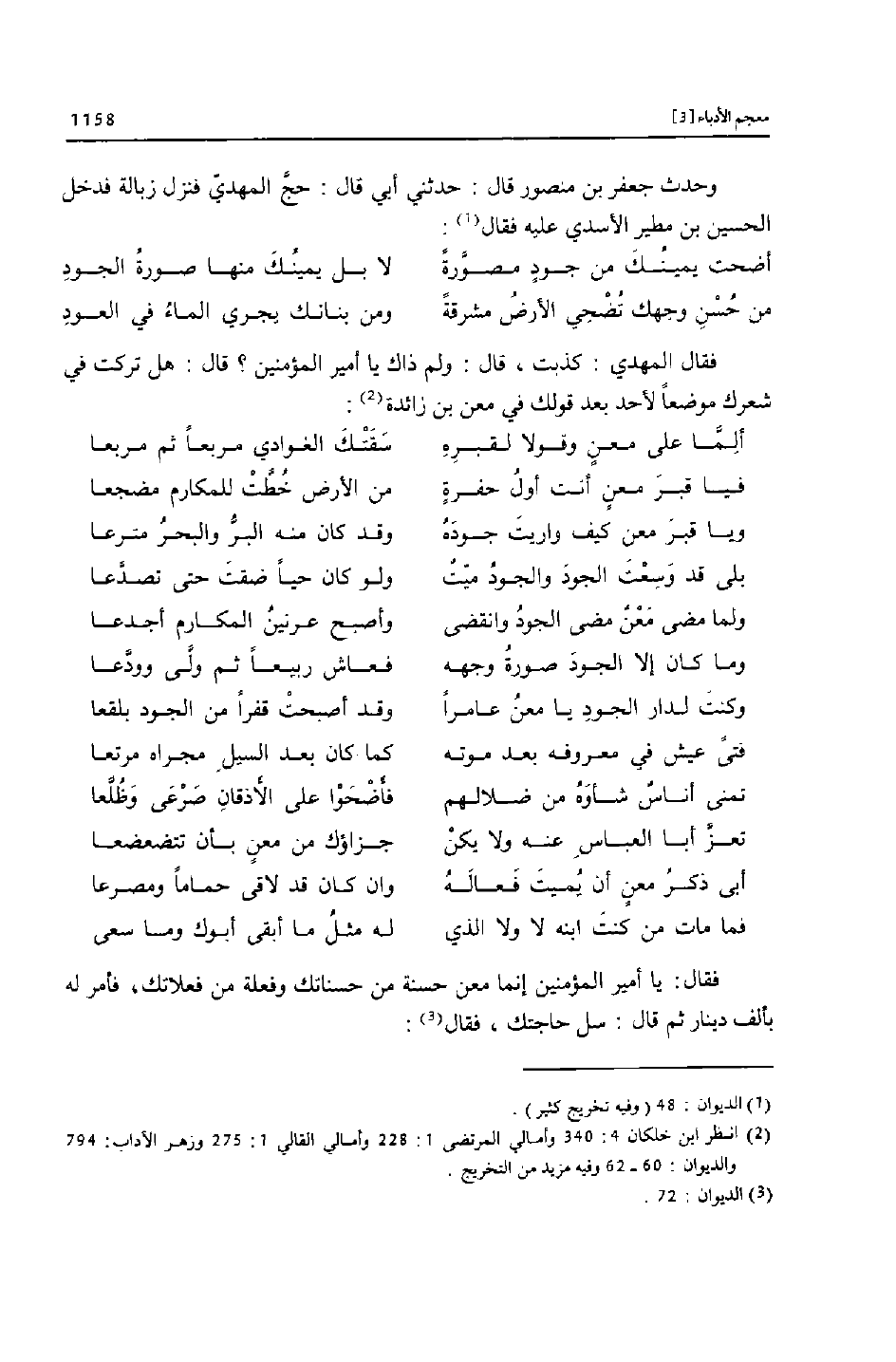 فقال المهدي: كذبت، قال: ولم ذاك يا أمير المؤمنين؟ قال: هل تركت في شعرك موضعا لأحد بعد قولك في معن بن زائدة [2] :