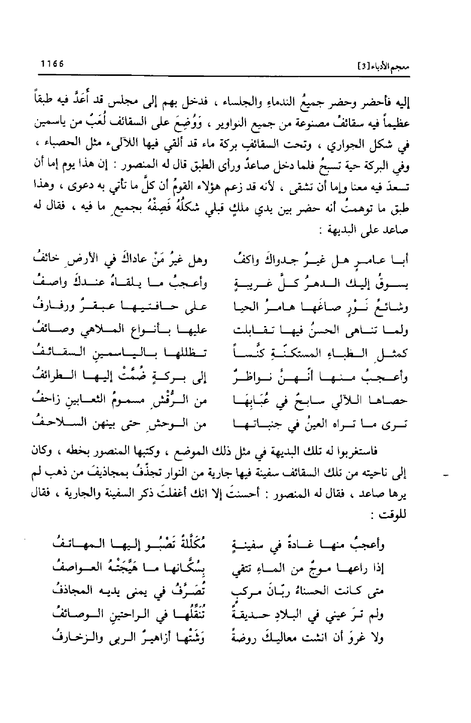 فاستغربوا له تلك البديهة في مثل ذلك الموضع، وكتبها المنصور بخطه، وكان إلى ناحيته من تلك السقائف سفينة فيها جارية من النوار تجذّف بمجاذيف من ذهب لم يرها صاعد، فقال له المنصور: أحسنت إلا انك أغفلت ذكر السفينة والجارية، فقال للوقت: