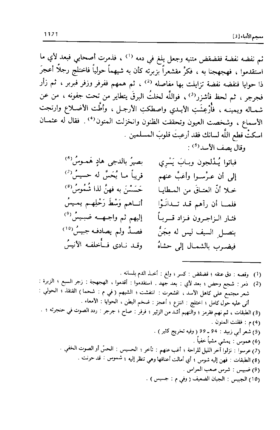 [2] ذمر: شجع وحض؛ بعد لأي: بعد جهد. استقدموا: أقدموا، الهجهجة: زجر السبع؛ الزبرة: