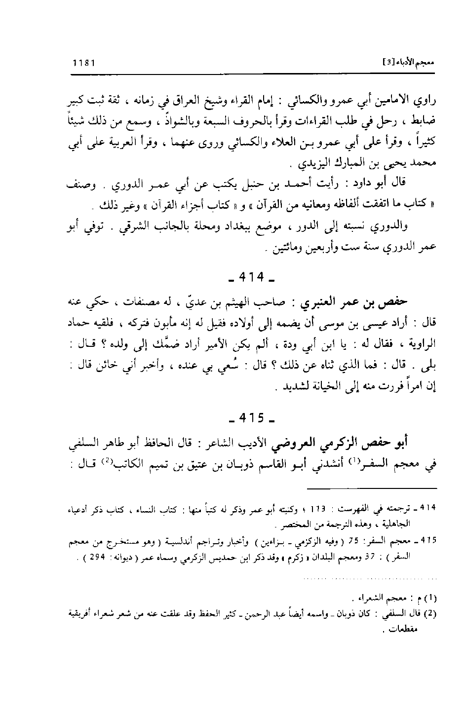 [415]- معجم السفر: 75 (وفيه الزكزمي- بزاءين) وأخبار وتراجم أندلسية (وهو مستخرج من معجم السفر) : 37 ومعجم البلدان «زكرم» وقد ذكر ابن حمديس الزكرمي وسماه عمر (ديوانه: 294) .