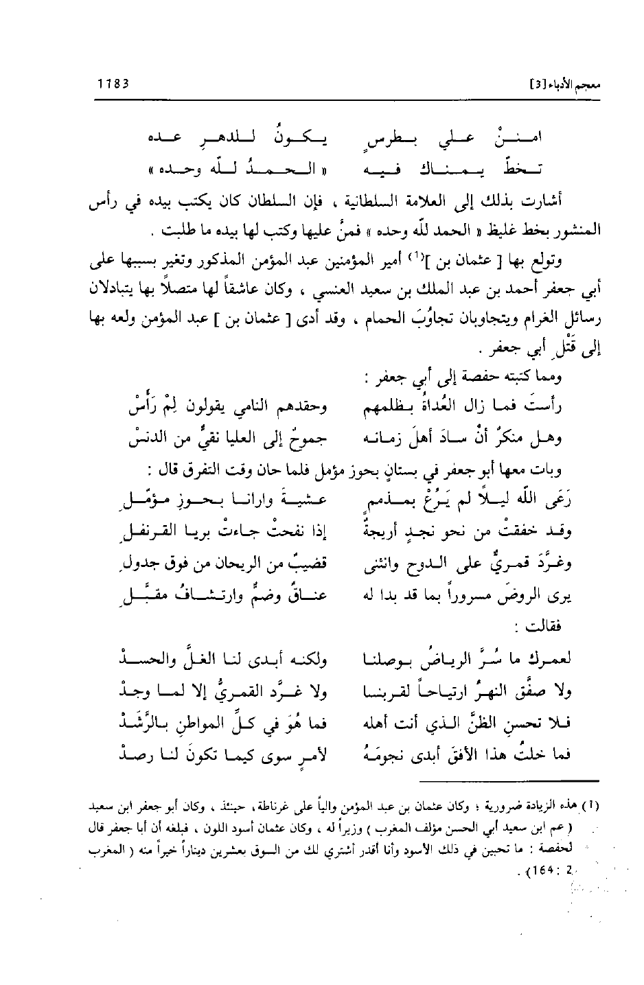 [1] هذه الزيادة ضرورية؛ وكان عثمان بن عبد المؤمن واليا على غرناطة، حينئذ، وكان أبو جعفر ابن سعيد (عم ابن سعيد أبي الحسن مؤلف المغرب) وزيرا له، وكان عثمان أسود اللون، فبلغه أن أبا جعفر قال لحفصة: ما تحبين في ذلك الأسود وأنا أقدر أشتري لك من السوق بعشرين دينارا خيرا منه (المغرب 2: 164) .
