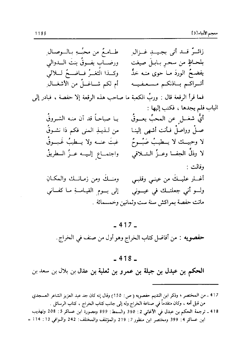 [417]- من المختصر؛ وذكر ابن النديم حفصويه (ص: 150) وقال إنه كان جد عبد العزيز الشاعر العسجدي من قبل أمه، وكان متقدما في صناعة الخراج وله إلى جانب كتاب الخراج، كتاب الرسائل.