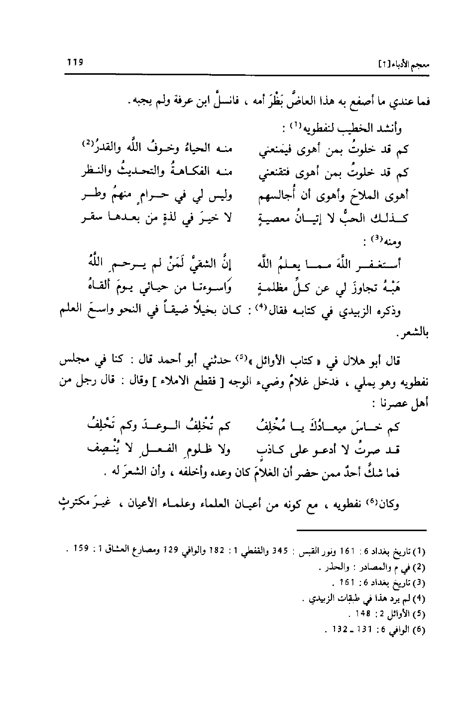 [1] تاريخ بغداد 6: 161 ونور القبس: 345 والقفطي 1: 182 والوافي 129 ومصارع العشاق 1: 159.