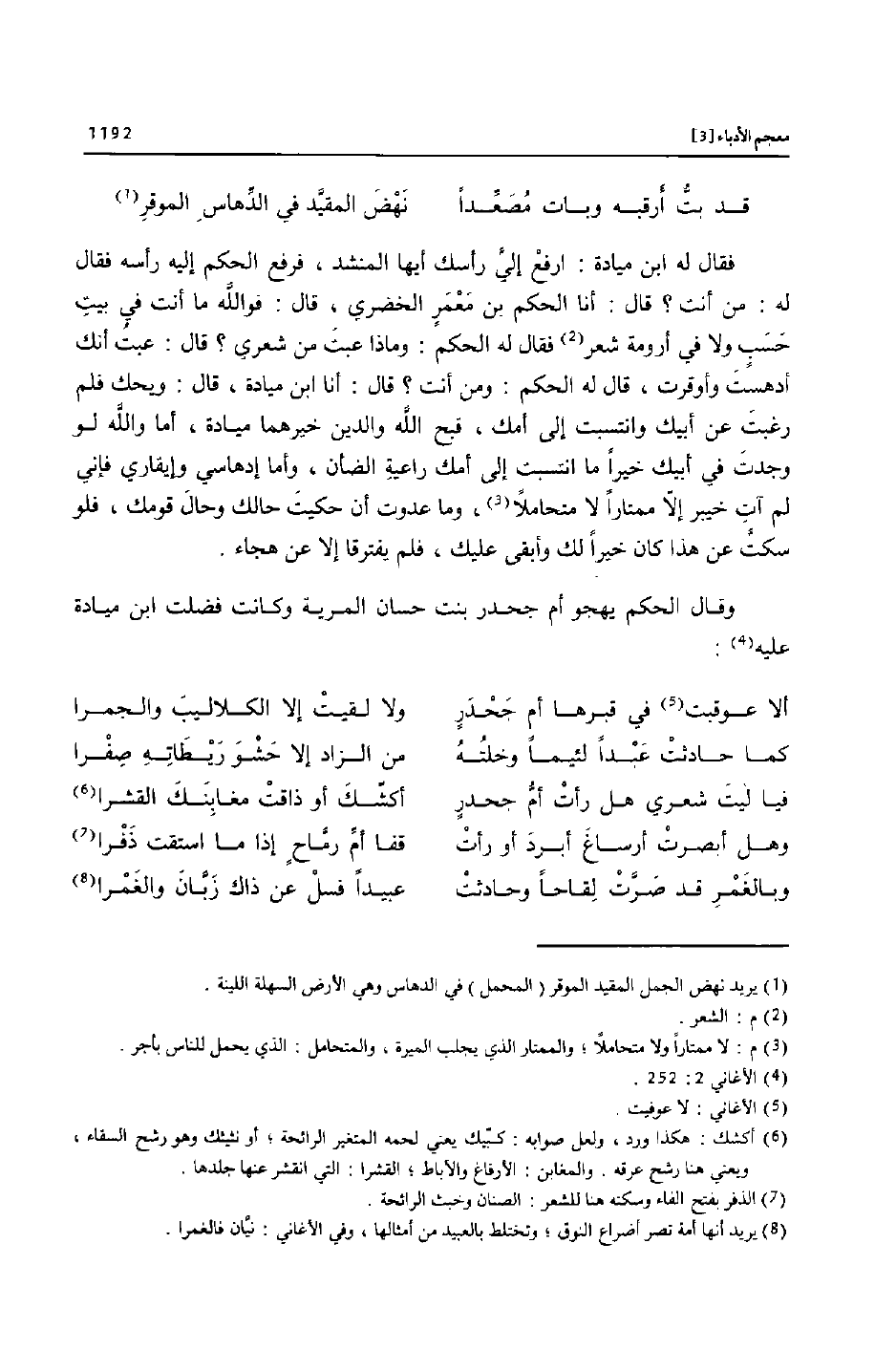 فقال له ابن ميادة: ارفع إليّ رأسك أيها المنشد، فرفع الحكم إليه رأسه فقال له: من أنت؟ قال: أنا الحكم بن معمر الخضري، قال: فو الله ما أنت في بيت حسب ولا في أرومة شعر [2] فقال له الحكم: وماذا عبت من شعري؟ قال: عبت أنك أدهست وأوقرت، قال له الحكم: ومن أنت؟ قال: أنا ابن ميادة، قال: ويحك فلم رغبت عن أبيك وانتسبت إلى أمك، قبح الله والدين خيرهما ميادة، أما والله لو وجدت في أبيك خيرا ما انتسبت إلى أمك راعية الضأن، وأما إدهاسي وإيقاري فإني لم آت خيبر إلّا ممتارا لا متحاملا [3] ، وما عدوت أن حكيت حالك وحال قومك، فلو سكتّ عن هذا كان خيرا لك وأبقى عليك، فلم يفترقا إلا عن هجاء.