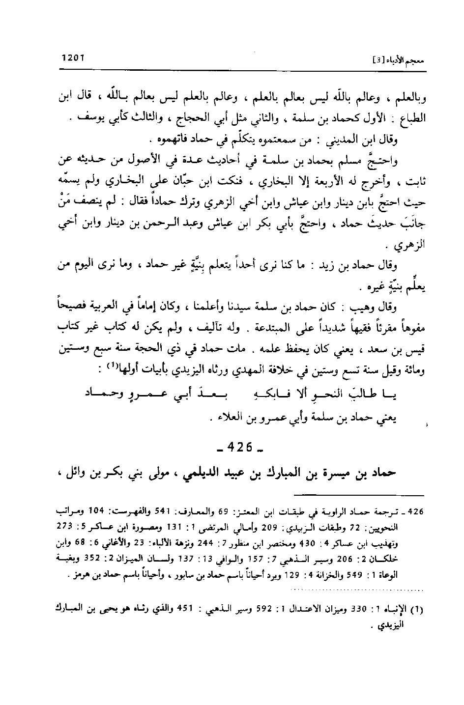 [426]- ترجمة حماد الراوية في طبقات ابن المعتز: 69 والمعارف: 541 والفهرست: 104 ومراتب النحويين: 72 وطبقات الزبيدي: 209 وأمالي المرتضى 1: 131 ومصورة ابن عساكر 5: 273 وتهذيب ابن عساكر 4: 430 ومختصر ابن منظور 7: 244 ونزهة الألباء: 23 والأغاني 6: 68 وابن خلكان 2: 206 وسير الذهبي 7: 157 والوافي 13: 137 ولسان الميزان 2: 352 وبغية الوعاة 1: 549 والخزانة 4: 129 ويرد أحيانا باسم حماد بن سابور، وأحيانا باسم حماد بن هرمز.