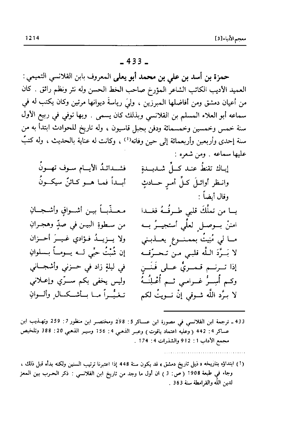 [433]- ترجمة ابن القلانسي في مصورة ابن عساكر 5: 298 ومختصر ابن منظور 7: 259 وتهذيب ابن عساكر 4: 442 (وعليه اعتماد ياقوت) وعبر الذهبي 4: 156 وسير الذهبي 20: 388 وتلخيص مجمع الآداب 1: 912 والشذرات 4: 174.