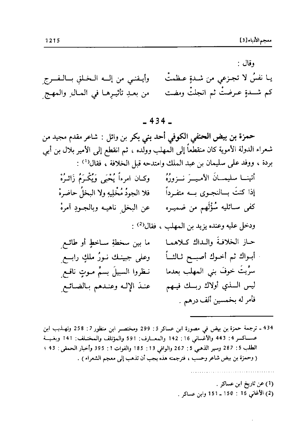 [434]- ترجمة حمزة بن بيض في مصورة ابن عساكر 5: 299 ومختصر ابن منظور 7: 258 وتهذيب ابن عساكر 4: 443 والأغاني 16: 142 والمعارف: 591 والمؤتلف والمختلف: 141 وبغية الطلب 5: 287 وسير الذهبي 5: 267 والوافي 13: 185 والفوات 1: 395 وأخبار الحمقى: 43؛ (وحمزة بن بيض شاعر وحسب، فترجمته هذه يجب أن تذهب إلى معجم الشعراء) .