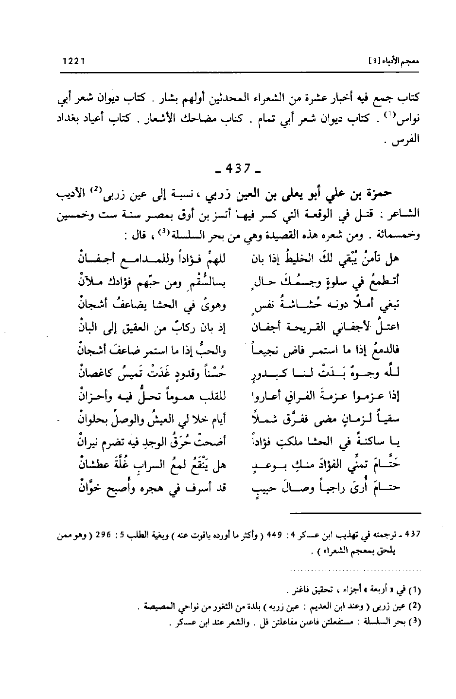 [437]- ترجمته في تهذيب ابن عساكر 4: 449 (وأكثر ما أورده ياقوت عنه) وبغية الطلب 5: 296 (وهو ممن يلحق بمعجم الشعراء) .