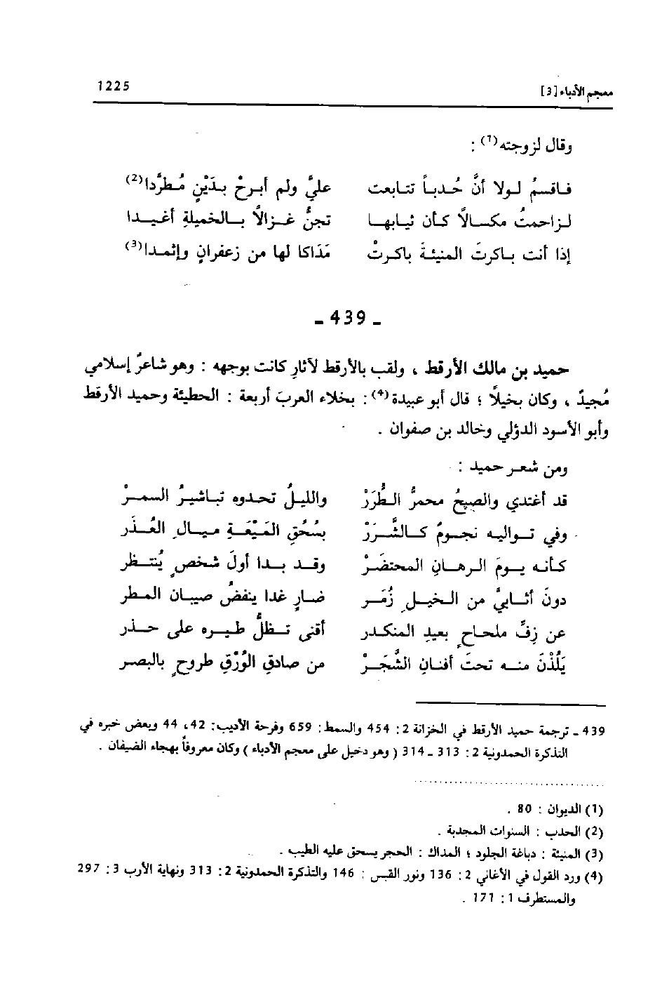 [439]- ترجمة حميد الأرقط في الخزانة 2: 454 والسمط: 659 وفرحة الأديب: 42، 44 وبعض خبره في التذكرة الحمدونية 2: 313- 314 (وهو دخيل على معجم الأدباء) وكان معروفا بهجاء الضيفان.