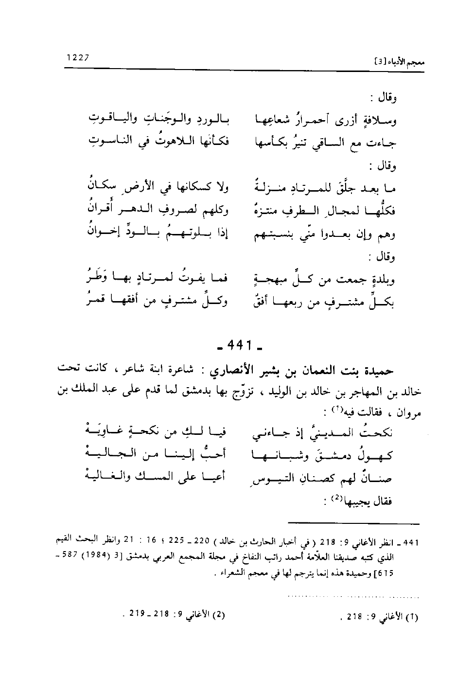 [441]- انظر الأغاني 9: 218 (في أخبار الحارث بن خالد) 220- 225؛ 16: 21 وانظر البحث القيم الذي كتبه صديقنا العلّامة أحمد راتب النفاخ في مجلة المجمع العربي بدمشق [3 (1984) 587- 615] وحميدة هذه إنما يترجم لها في معجم الشعراء.