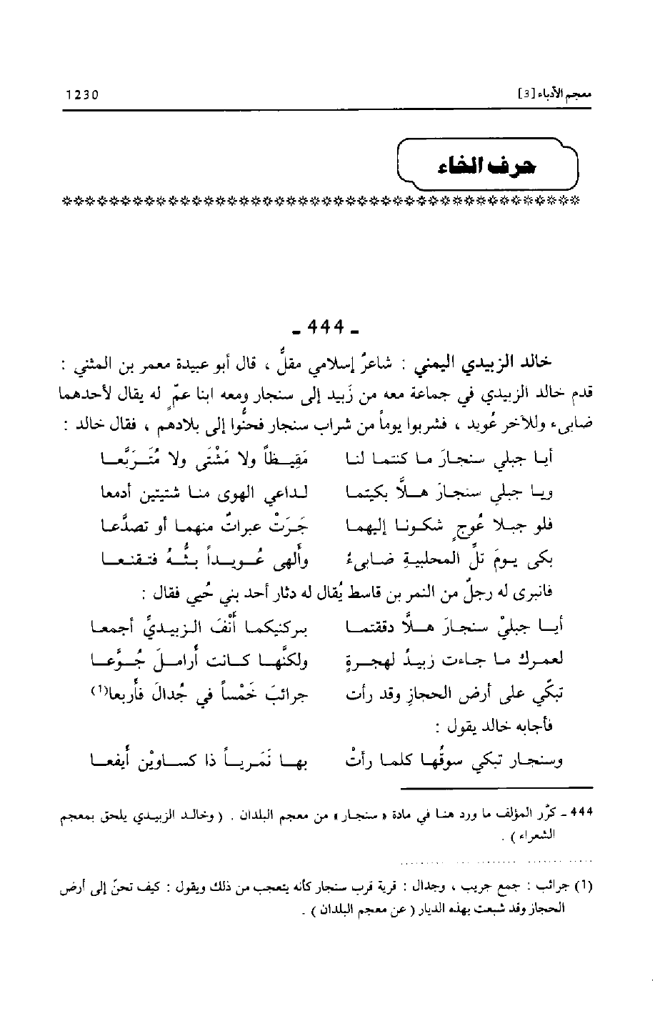 [444]- كرّر المؤلف ما ورد هنا في مادة «سنجار» من معجم البلدان. (وخالد الزبيدي يلحق بمعجم الشعراء) .