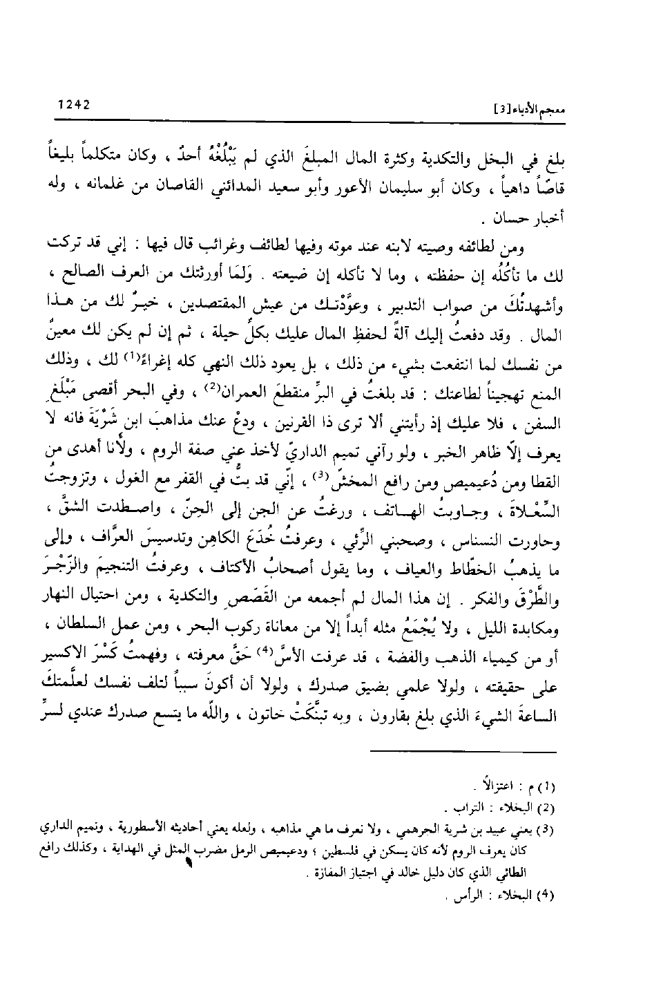 ومن لطائفه وصيته لابنه عند موته وفيها لطائف وغرائب قال فيها: إني قد تركت لك ما تأكله إن حفظته، وما لا تأكله إن ضيعته. ولما أورثتك من العرف الصالح، وأشهدتك من صواب التدبير، وعوّدتك من عيش المقتصدين، خير لك من هذا المال. وقد دفعت إليك آلة لحفظ المال عليك بكلّ حيلة، ثم إن لم يكن لك معين من نفسك لما انتفعت بشيء من ذلك، بل يعود ذلك النهي كله إغراء [1] لك، وذلك المنع تهجينا لطاعتك: قد بلغت في البرّ منقطع العمران [2] ، وفي البحر أقصى مبلغ السفن، فلا عليك إذ رأيتني ألا ترى ذا القرنين، ودع عنك مذاهب ابن شرية فانه لا يعرف إلّا ظاهر الخبر، ولو رآني تميم الداريّ لأخذ عني صفة الروم، ولأنا أهدى من القطا ومن دعيميص ومن رافع المخشّ [3] ، إنّي قد بتّ في القفر مع الغول، وتزوجت السّعلاة، وجاوبت الهاتف، ورغت عن الجن إلى الحنّ، واصطدت الشقّ، وحاورت النسناس، وصحبني الرّئي، وعرفت خدع الكاهن وتدسيس العرّاف، وإلى ما يذهب الخطّاط والعياف، وما يقول أصحاب الأكتاف، وعرفت التنجيم والزّجر والطّرق والفكر. إن هذا المال لم أجمعه من القصص والتكدية، ومن احتيال النهار ومكابدة الليل، ولا يجمع مثله أبدا إلا من معاناة ركوب البحر، ومن عمل السلطان، أو من كيمياء الذهب والفضة، قد عرفت الأسّ [4] حقّ معرفته، وفهمت كسر الاكسير على حقيقته، ولولا علمي بضيق صدرك، ولولا أن أكون سببا لتلف نفسك لعلّمتك الساعة الشيء الذي بلغ بقارون، وبه تبنّكت خاتون، والله ما يتسع صدرك عندي لسرّ