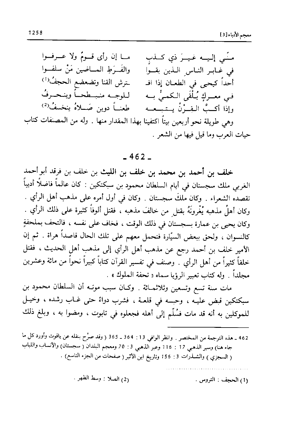[462]- هذه الترجمة من المختصر. وانظر الوافي 13: 364- 365 (وقد صرّح بنقله عن ياقوت وأورد كل ما جاء هنا) وسير الذهبي 17: 116 وعبر الذهبي 3: 70 ومعجم البلدان (سجستان) والأنساب واللباب (السجزي) والشذرات 3: 156 وتاريخ ابن الأثير (صفحات من الجزء التاسع) .
