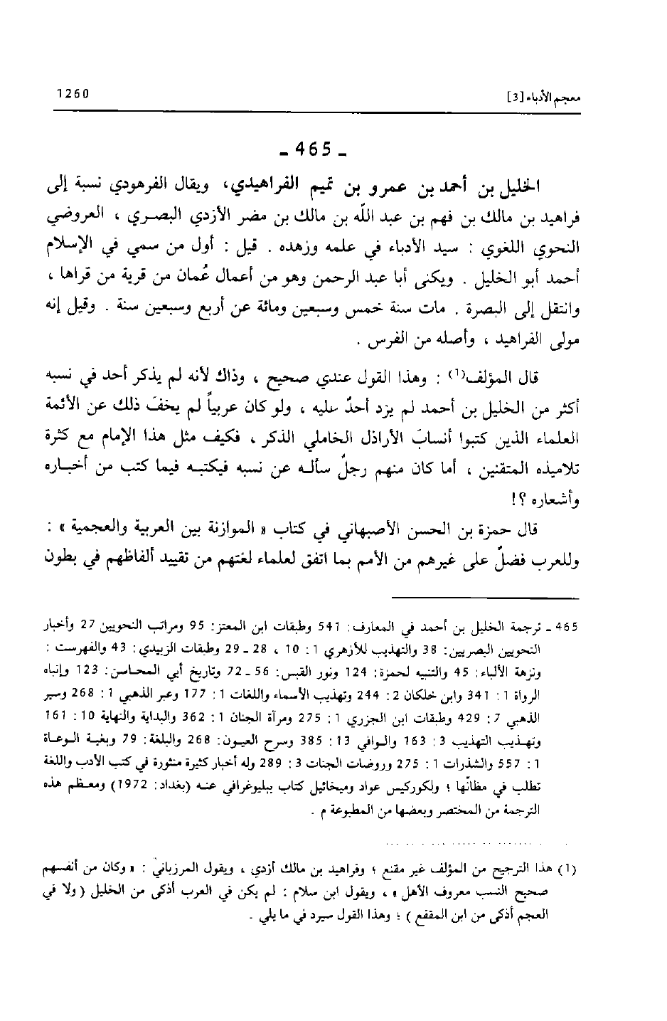 [465]- ترجمة الخليل بن أحمد في المعارف: 541 وطبقات ابن المعتز: 95 ومراتب النحويين 27 وأخبار النحويين البصريين: 38 والتهذيب للأزهري 1: 10، 28- 29 وطبقات الزبيدي: 43 والفهرست: