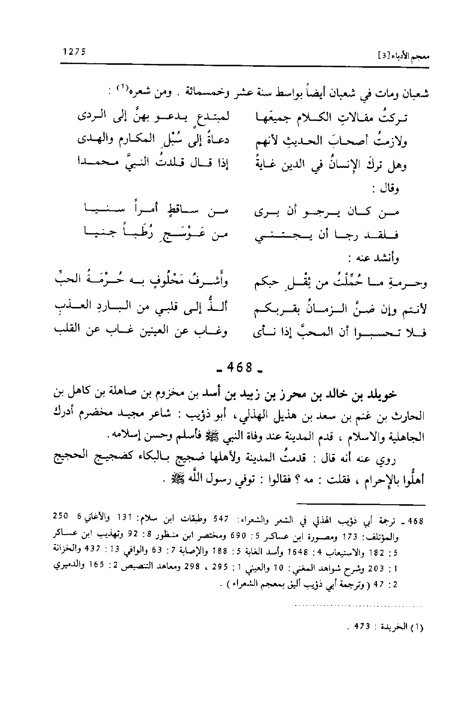 [468]- ترجمة أبي ذؤيب الهذلي في الشعر والشعراء: 547 وطبقات ابن سلام: 131 والأغاني 6: 250 والمؤتلف: 173 ومصورة ابن عساكر 5: 690 ومختصر ابن منظور 8: 92 وتهذيب ابن عساكر 5: 182 والاستيعاب 4: 1648 وأسد الغابة 5: 188 والإصابة 7: 63 والوافي 13: 437 والخزانة 1: 203 وشرح شواهد المغني: 10 والعيني 1: 295، 298 ومعاهد التنصيص 2: 165 والدميري 2: 47 (وترجمة أبي ذؤيب أليق بمعجم الشعراء) .