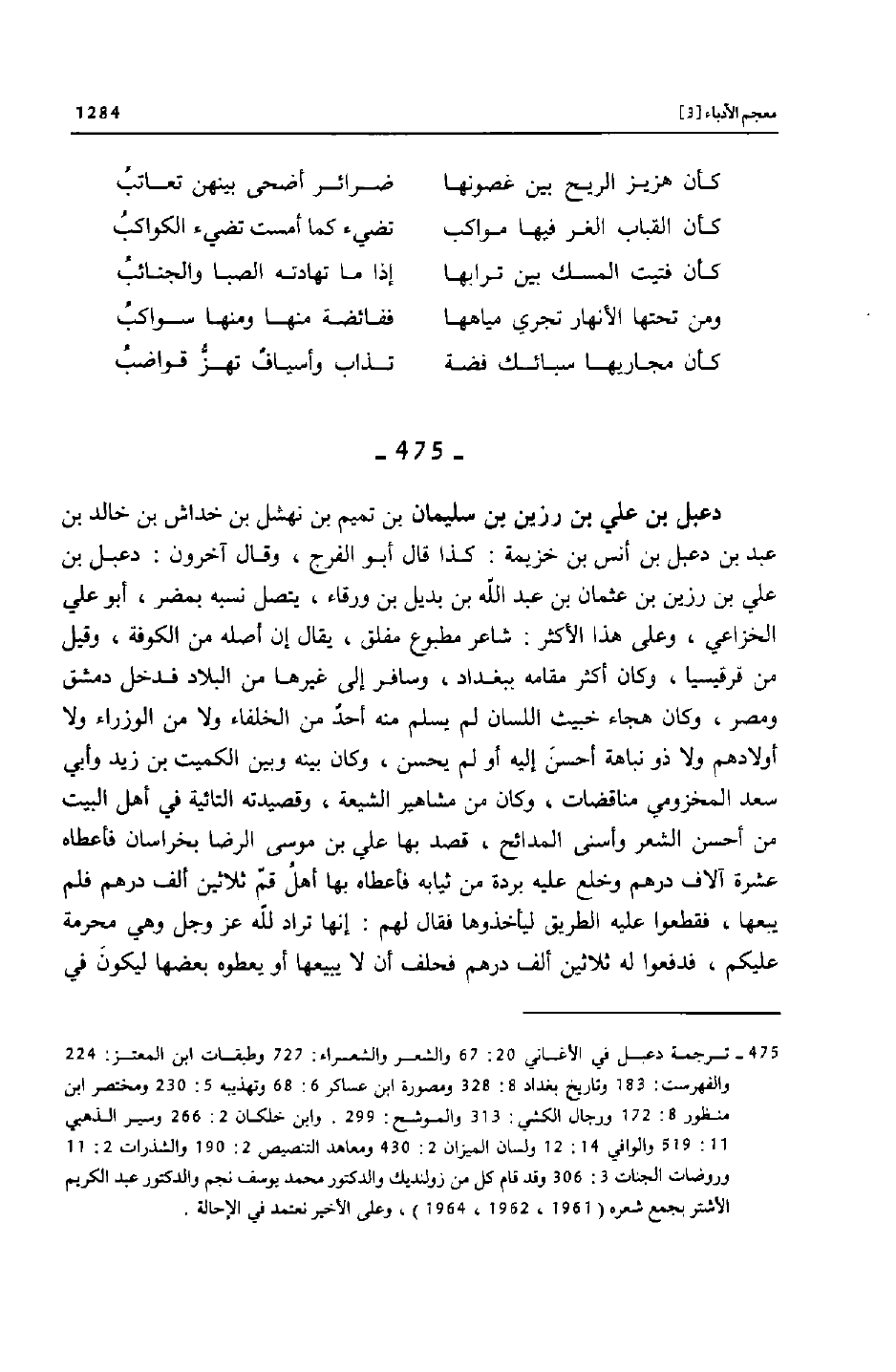 [475]- ترجمة دعبل في الأغاني 20: 67 والشعر والشعراء: 727 وطبقات ابن المعتز: 224 والفهرست: 183 وتاريخ بغداد 8: 328 ومصورة ابن عساكر 6: 68 وتهذيبه 5: 230 ومختصر ابن منظور 8: 172 ورجال الكشي: 313 والموشح: 299. وابن خلكان 2: 266 وسير الذهبي 11: 519 والوافي 14: 12 ولسان الميزان 2: 430 ومعاهد التنصيص 2: 190 والشذرات 2: 11 وروضات الجنات 3: 306 وقد قام كل من زولنديك والدكتور محمد يوسف نجم والدكتور عبد الكريم الأشتر بجمع شعره (1961، 1962، 1964) ، وعلى الأخير نعتمد في الإحالة.