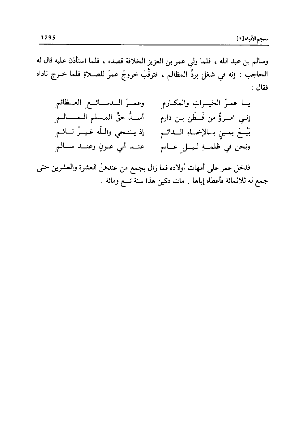 وسالم بن عبد الله، فلما ولي عمر بن العزيز الخلافة قصده، فلما استأذن عليه قال له الحاجب: إنه في شغل بردّ المظالم، فترقّب خروج عمر للصلاة فلما خرج ناداه فقال: