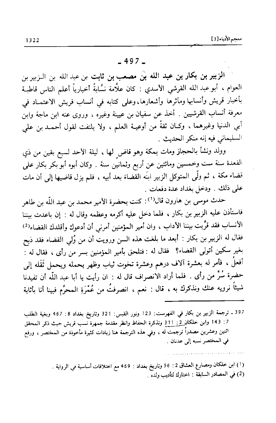 [497]- ترجمة الزبير بن بكار في الفهرست: 123 ونور القبس: 321 وتاريخ بغداد 8: 467 وبغية الطلب 7: 143 وابن خلكان 2: 311 وتذكرة الحفاظ وانظر مقدمة جمهرة نسب قريش حيث ذكر المحقق اثنين وعشرين مصدرا ترجمت له، وفي هذه الترجمة هنا زيادات كثيرة مأخوذة من المختصر، ورفع في المختصر نسبه إلى عدنان.