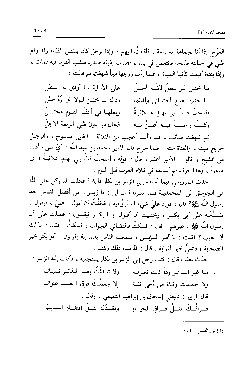 ثم شهقت فماتت، فما رأيت أعجب من الثلاثة: الظبي مذبوح، والرجل جريح ميت، والفتاة ميتة. فلما خرج قال الأمير محمد بن عبد الله: أيّ شيء أفدنا من الشيخ، قالوا: الأمير أعلم، قال: قوله «أضحت فتاة بني نهد علانية» أي ظاهرة، وهذا حرف لم أسمعه في كلام العرب قبل اليوم.