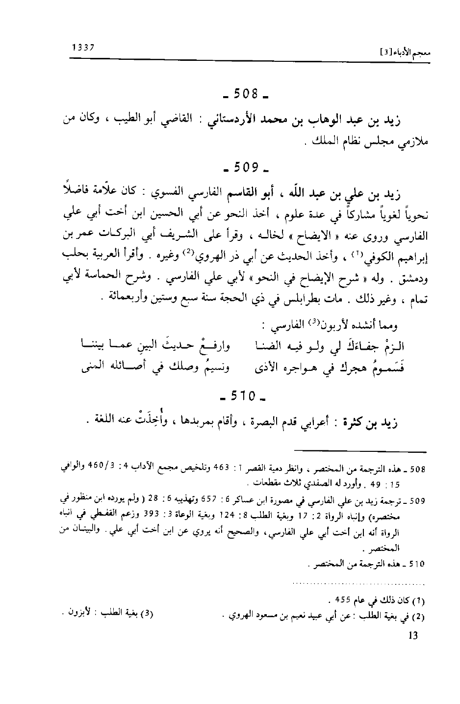 [509]- ترجمة زيد بن علي الفارسي في مصورة ابن عساكر 6: 657 وتهذيبه 6: 28 (ولم يورده ابن منظور في مختصره) وإنباه الرواة 2: 17 وبغية الطلب 8: 124 وبغية الوعاة 3: 393 وزعم القفطي في انباه الرواة أنه ابن أخت أبي علي الفارسي، والصحيح أنه يروي عن ابن أخت أبي علي. والبيتان من المختصر.