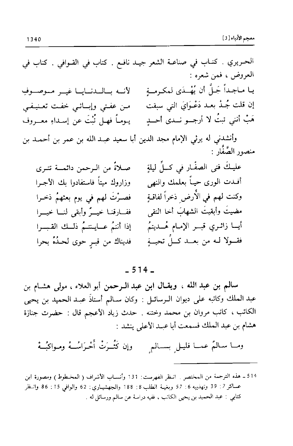 [514]- هذه الترجمة من المختصر. انظر الفهرست: 131 وأنساب الأشراف (المخطوط) ومصورة ابن عساكر 7: 39 وتهذيبه 6: 57 وبغية الطلب 8: 188 والجهشياري: 62 والوافي 15: 86 وانظر كتابي: عبد الحميد بن يحيى الكاتب، ففيه دراسة عن سالم ورسائل له.