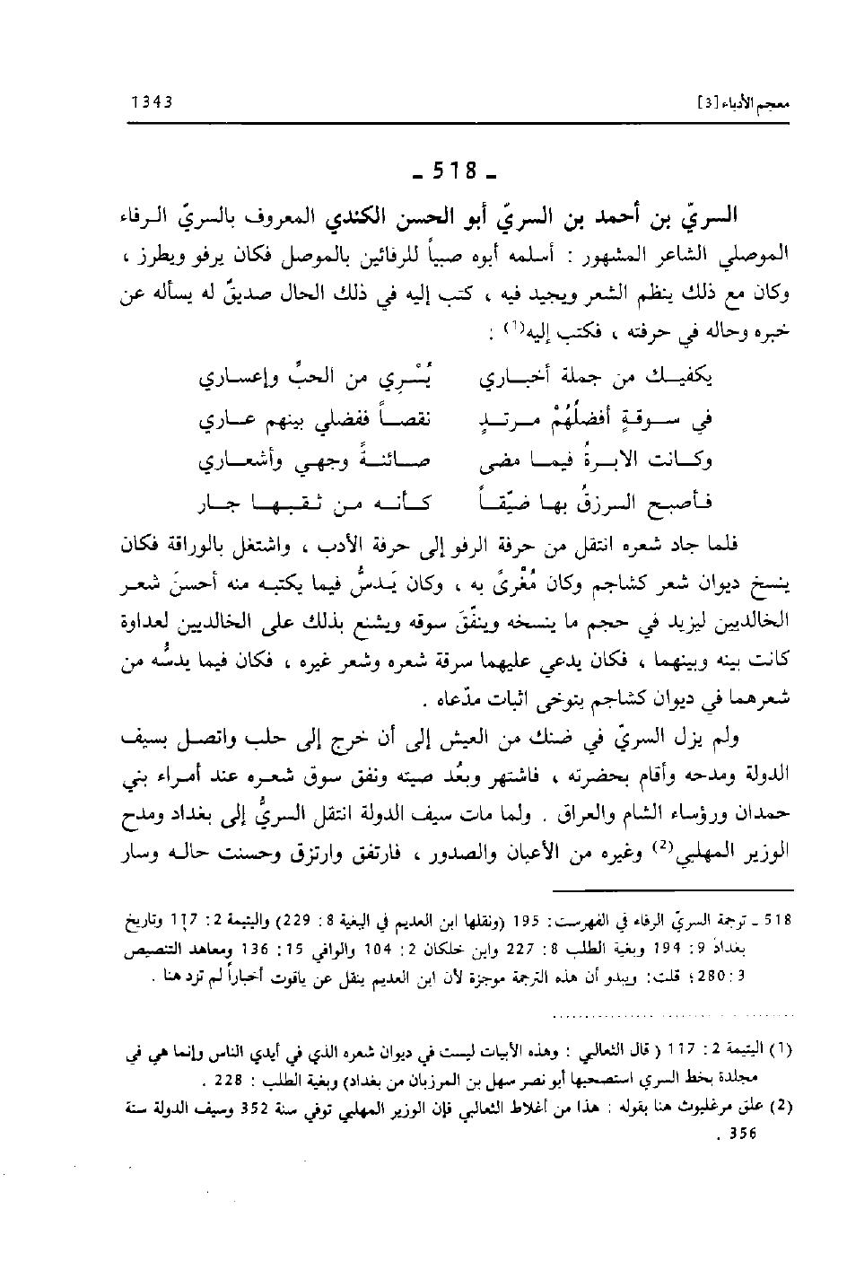 [518]- ترجمة السريّ الرفاء في الفهرست: 195 (ونقلها ابن العديم في البغية 8: 229) واليتيمة 2: 117 وتاريخ بغداد 9: 194 وبغية الطلب 8: 227 وابن خلكان 2: 104 والوافي 15: 136 ومعاهد التنصيص 3: 280؛ قلت: ويبدو أن هذه الترجمة موجزة لأن ابن العديم ينقل عن ياقوت أخبارا لم ترد هنا.