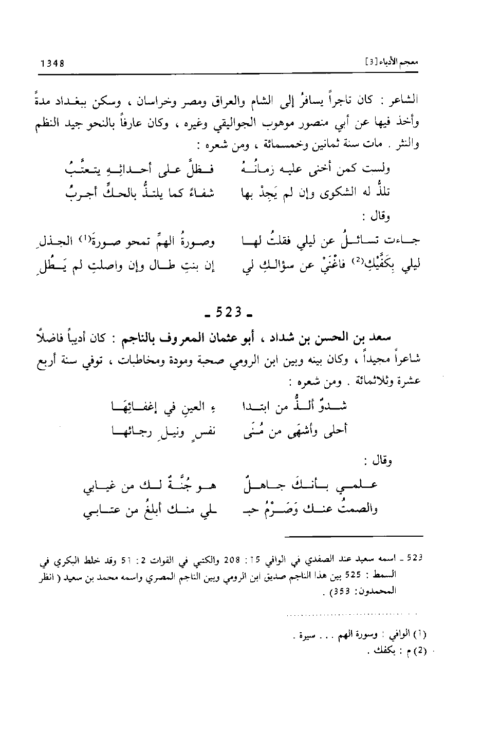 [523]- اسمه سعيد عند الصفدي في الوافي 15: 208 والكتبي في الفوات 2: 51 وقد خلط البكري في السمط: 525 بين هذا الناجم صديق ابن الرومي وبين الناجم المصري واسمه محمد بن سعيد (انظر المحمدون: 353) .