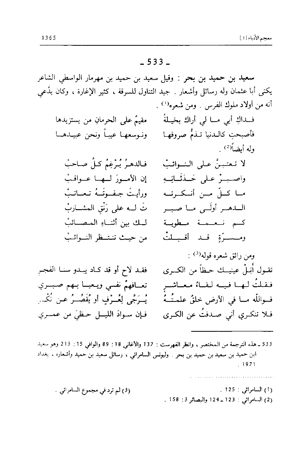 [533]- هذه الترجمة من المختصر، وانظر الفهرست: 137 والأغاني 18: 89 والوافي 15: 213 وهو سعيد ابن حميد بن سعيد بن حميد بن بحر. وليونس السامرائي، رسائل سعيد بن حميد وأشعاره، بغداد 1971.