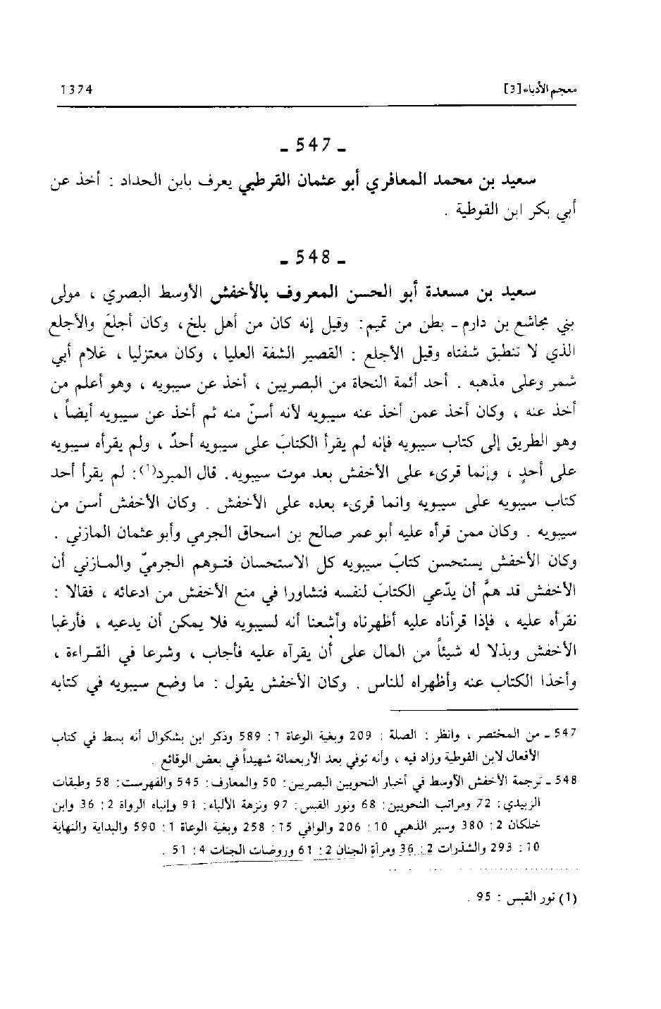 [548]- ترجمة الأخفش الأوسط في أخبار النحويين البصريين: 50 والمعارف: 545 والفهرست: 58 وطبقات الزبيدي: 72 ومراتب النحويين: 68 ونور القبس: 97 ونزهة الألباء: 91 وإنباه الرواة 2: 36 وابن خلكان 2: 380 وسير الذهبي 10: 206 والوافي 15: 258 وبغية الوعاة 1: 590 والبداية والنهاية 10: 293 والشذرات 2: 36 ومرآة الجنان 2: 61 وروضات الجنات 4: 51.