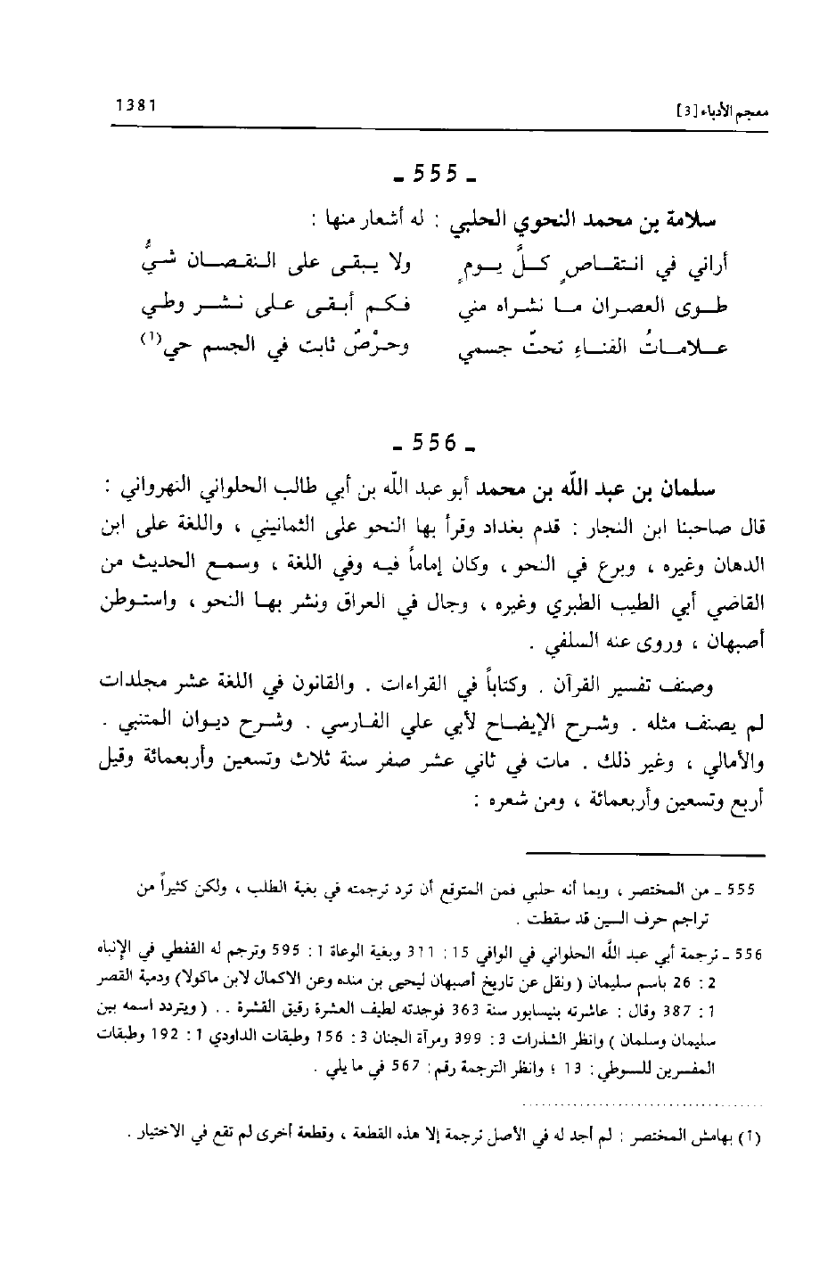 [556]- ترجمة أبي عبد الله الحلواني في الوافي 15: 311 وبغية الوعاة 1: 595 وترجم له القفطي في الإنباه 2: 26 باسم سليمان (ونقل عن تاريخ أصبهان ليحيى بن منده وعن الاكمال لابن ماكولا) ودمية القصر 1: 387 وقال: عاشرته بنيسابور سنة 363 فوجدته لطيف العشرة رقيق القشرة.. (ويتردد اسمه بين سليمان وسلمان) وانظر الشذرات 3: 399 ومرآة الجنان 3: 156 وطبقات الداودي 1: 192 وطبقات المفسرين للسوطي: 13؛ وانظر الترجمة رقم: 567 في ما يلي.