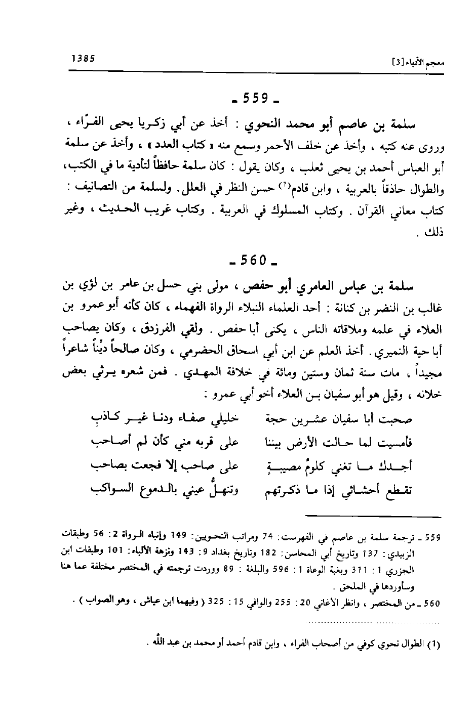 [559]- ترجمة سلمة بن عاصم في الفهرست: 74 ومراتب النحويين: 149 وإنباه الرواة 2: 56 وطبقات الزبيدي: 137 وتاريخ أبي المحاسن: 182 وتاريخ بغداد 9: 143 ونزهة الألباء: 101 وطبقات ابن الجزري 1: 311 وبغية الوعاة 1: 596 والبلغة: 89 ووردت ترجمته في المختصر مختلفة عما هنا وسأوردها في الملحق.