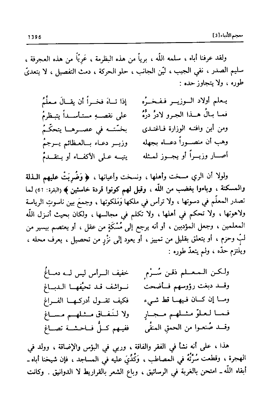 (البقرة: 61) لما تصدر المعلّم في دسوتها، ولا ترأس في ملكها وملكوتها، وجمع بين ناسوت الرياسة ولا هوتها، ولا تحكم في أهلها، ولا تكلم في مجالسها، ولكان بحيث أنزل الله المعلمين، وجعل المؤدبين، أو أنه يرجع إلى مسكة من عقل، أو يعتصم بيسير من لبّ وحزم، أو يتعلق بقليل من تمييز، أو يعود إلى نزر من تحصيل، يعرف محله، ويلتزم حدّه، ولم يتعدّ طوره: