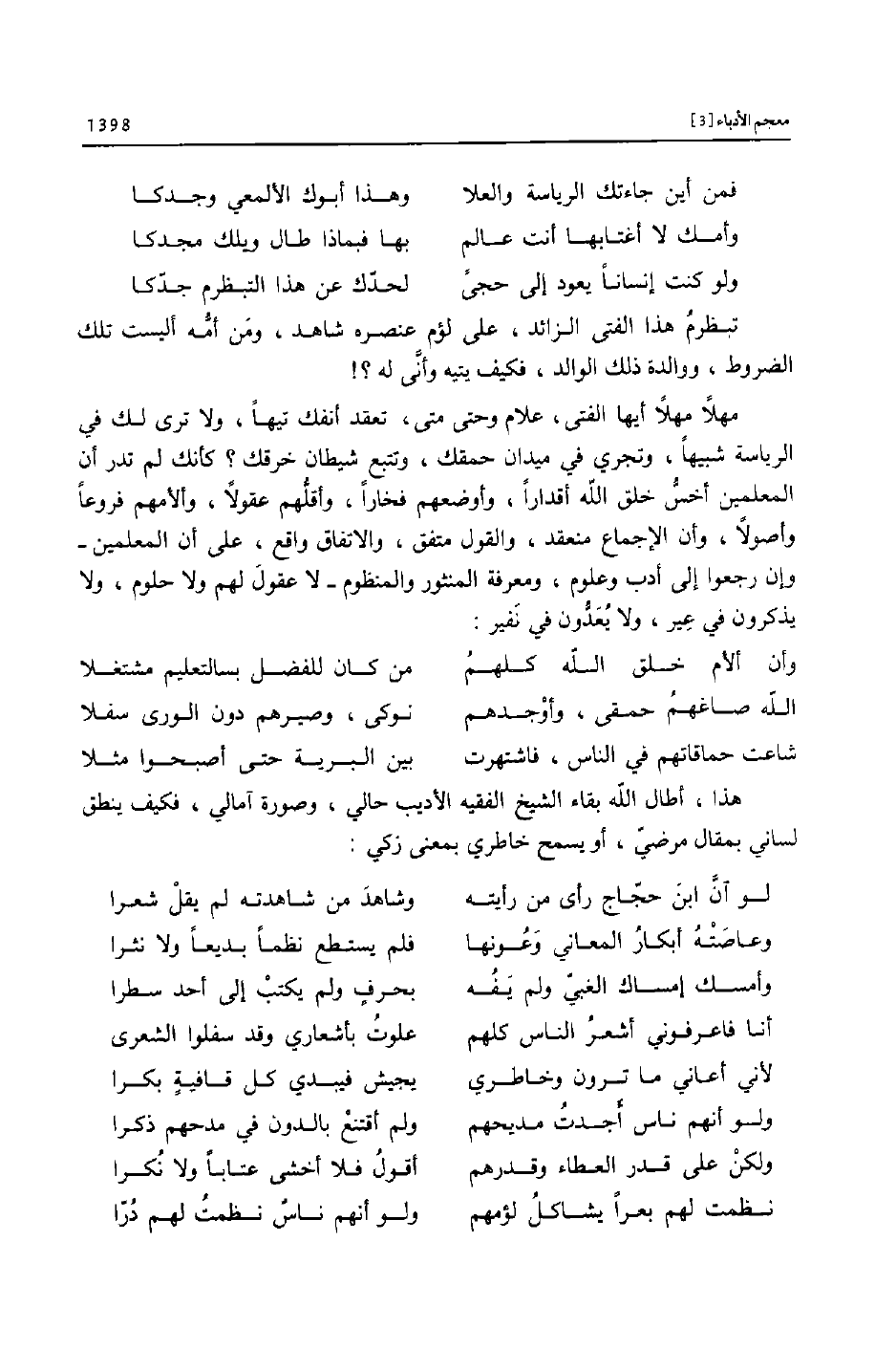 تبظرم هذا الفتى الزائد، على لؤم عنصره شاهد، ومن أمّه أليست تلك الضروط، ووالدة ذلك الوالد، فكيف يتيه وأنّى له؟! مهلا مهلا أيها الفتى، علام وحتى متى، تعقد أنفك تيها، ولا ترى لك في الرياسة شبيها، وتجري في ميدان حمقك، وتتبع شيطان خرقك؟ كأنك لم تدر أن المعلمين أخسّ خلق الله أقدارا، وأوضعهم فخارا، وأقلّهم عقولا، وألأمهم فروعا وأصولا، وأن الإجماع منعقد، والقول متفق، والاتفاق واقع، على أن المعلمين- وإن رجعوا إلى أدب وعلوم، ومعرفة المنثور والمنظوم- لا عقول لهم ولا حلوم، ولا يذكرون في عير، ولا يعدّون في نفير:
