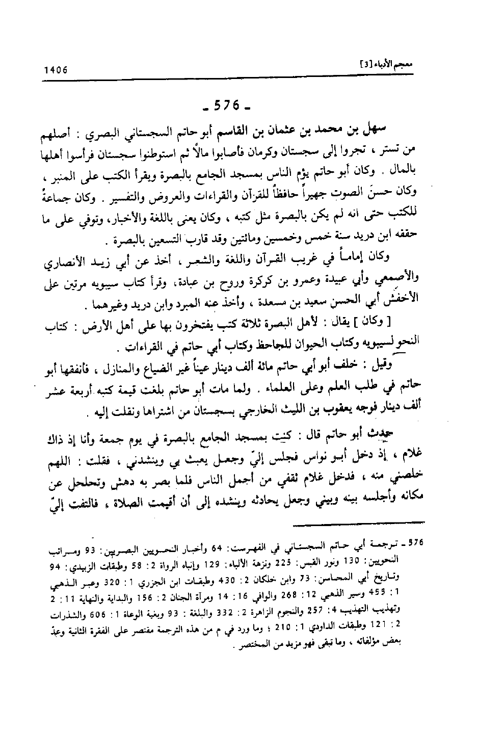 [576]- ترجمة أبي حاتم السجستاني في الفهرست: 64 وأخبار النحويين البصريين: 93 ومراتب النحويين: 130 ونور القبس: 225 ونزهة الألباء: 129 وإنباه الرواة 2: 58 وطبقات الزبيدي: 94 وتاريخ أبي المحاسن: 73 وابن خلكان 2: 430 وطبقات ابن الجزري 1: 320 وعبر الذهبي 1: 455 وسير الذهبي 12: 268 والوافي 16: 14 ومرآة الجنان 2: 156 والبداية والنهاية 11: 2 وتهذيب التهذيب 4: 257 والنجوم الزاهرة 2: 332 والبلغة: 93 وبغية الوعاة 1: 606 والشذرات 2: 121 وطبقات الداودي 1: 210؛ وما ورد في م من هذه الترجمة مقتصر على الفقرة الثانية وعدّ بعض مؤلفاته، وما تبقى فهو مزيد من المختصر.