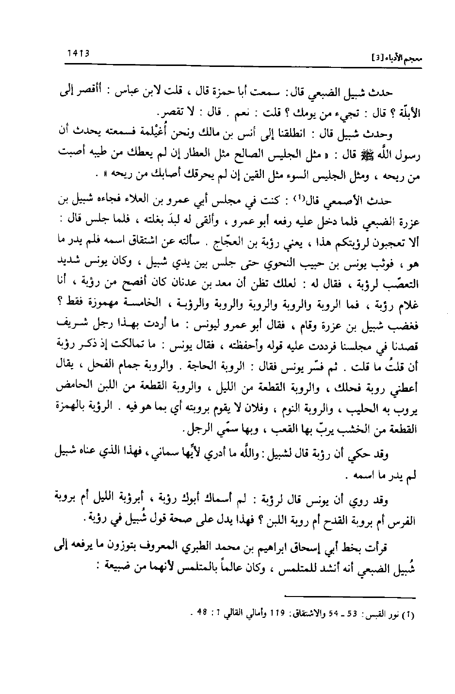 ألا تعجبون لرؤبتكم هذا، يعني رؤبة بن العجّاج. سألته عن اشتقاق اسمه فلم يدر ما هو، فوثب يونس بن حبيب النحوي حتى جلس بين يدي شبيل، وكان يونس شديد التعصّب لرؤبة، فقال له: لعلك تظن أن معد بن عدنان كان أفصح من رؤبة، أنا غلام رؤبة، فما الروبة والروبة والروبة والروبة والرؤبة، الخامسة مهموزة فقط؟