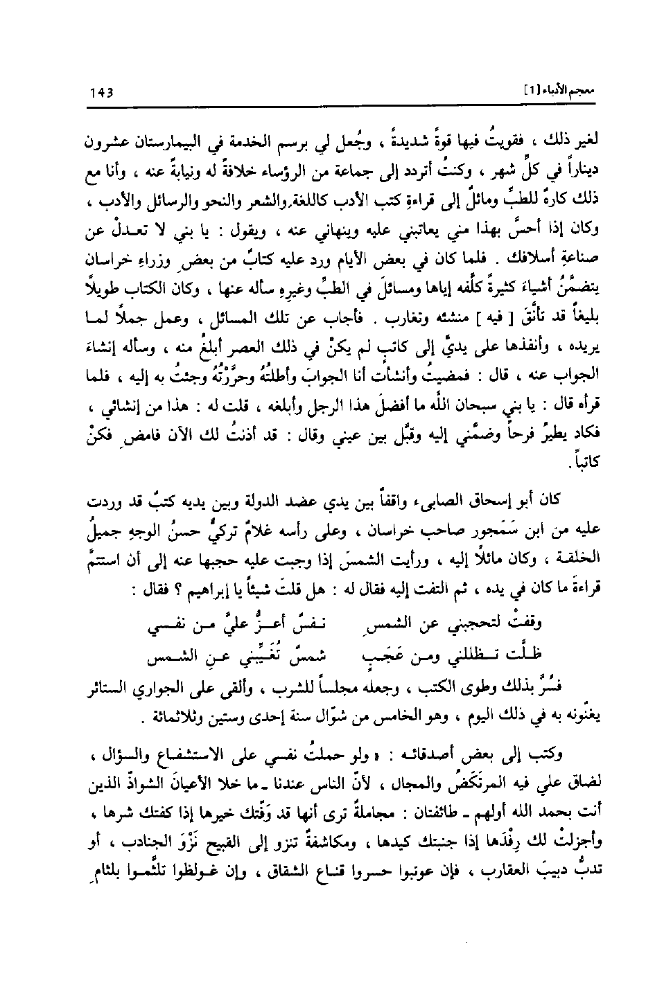 لغير ذلك، فقويت فيها قوة شديدة، وجعل لي برسم الخدمة في البيمارستان عشرون دينارا في كلّ شهر، وكنت أتردد إلى جماعة من الرؤساء خلافة له ونيابة عنه، وأنا مع ذلك كاره للطب ومائل إلى قراءة كتب الأدب كاللغة والشعر والنحو والرسائل والأدب، وكان إذا أحسّ بهذا مني يعاتبني عليه وينهاني عنه، ويقول: يا بني لا تعدل عن صناعة أسلافك. فلما كان في بعض الأيام ورد عليه كتاب من بعض وزراء خراسان يتضمّن أشياء كثيرة كلّفه إياها ومسائل في الطبّ وغيره سأله عنها، وكان الكتاب طويلا بليغا قد تأنّق [فيه] منشئه وتغارب. فأجاب عن تلك المسائل، وعمل جملا لما يريده، وأنفذها على يديّ إلى كاتب لم يكن في ذلك العصر أبلغ منه، وسأله إنشاء الجواب عنه، قال: فمضيت وأنشأت أنا الجواب وأطلته وحرّرته وجئت به إليه، فلما قرأه قال: يا بني سبحان الله ما أفضل هذا الرجل وأبلغه، قلت له: هذا من إنشائي، فكاد يطير فرحا وضمّني إليه وقبّل بين عيني وقال: قد أذنت لك الآن فامض فكن كاتبا.