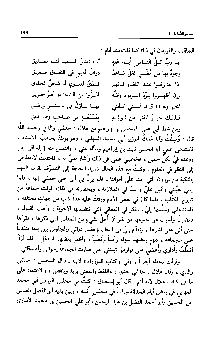 ومن خط أبي علي المحسن بن إبراهيم بن هلال: حدثني والدي رحمه الله قال: وصفت وأنا حدث للوزير أبي محمد المهلبي، وهو يومئذ يخاطب بالأستاذ، فاستدعى عمي أبا الحسن ثابت بن إبراهيم وسأله عني، والتمس منه [إلحاقي به] ووعده فيّ بكلّ جميل، فخاطبني عمي في ذلك وأشار عليّ به، فامتنعت لانقطاعي إلى النظر في العلوم. وكنت مع هذه الحال شديد الحاجة إلى التصرّف لقرب العهد بالنكبة من توزون التي أتت على أموالنا، فلم يزل بي أبي حتى حملني إليه، فلما رآني تقبّلني وأقبل عليّ ورسم لي الملازمة، وبحضرته في ذلك الوقت جماعة من شيوخ الكتّاب، فلما كان في بعض الأيام وردت عليه عدة كتب من جهات مختلفة، فاستدعاني وسلّمها إليّ، وذكر لي المعاني التي تتضمنها الأجوبة، وأطال القول، فمضيت وأجبت عن جميعها من غير أن أخلّ بشيء من المعاني التي ذكرها، فقرأها حتى أتى على آخرها، وتقدّم إليّ في الحال بإحضار دواتي والجلوس بين يديه متقدما على الجماعة، فلزم بعضهم منزله وجدا وغضبا، وأظهر بعضهم التعالل، فلم أزل أتلطّف وأداري وأغضي على قوارص تبلغني حتى صارت الجماعة إخواني وأصدقائي.