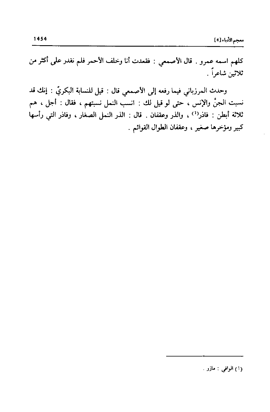 وحدث المرزباني فيما رفعه إلى الأصمعي قال: قيل للنسابة البكريّ: إنك قد نسبت الجنّ والإنس، حتى لو قيل لك: انسب النمل نسبتهم، فقال: أجل، هم ثلاثة أبطن: فاذر «1» ، والذر وعقفان. قال: الذر النمل الصغار، وفاذر التي رأسها كبير ومؤخرها صغير، وعقفان الطوال القوائم.